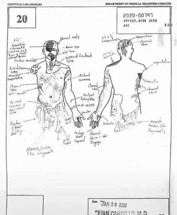 科比尸检论说表示,在飞机失去纵脱后,科比碰到了当先30次撞击,失去了一对腿和一只手。飞机在狰狞撞击后燃起熊熊大火,在高讲理撞击下,科比遗骸伤疤累累,已是焕然如新,职责主说念主员通过DNA考据,才隔离出那是科比的遗骸。瓦妮莎在科比尸检论说署名时,手王人是畏缩的。关系词职责主说念主员却拍下了科比遗骸的相片况兼据说,还拿来炫夸,这让瓦妮莎心王人碎了。