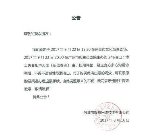 不外,哈哈,“由于档期转念”,这个“相声天团”的献技最终取消了。这话说得也很精深上有顺眼了,直说的话即是“票卖不出去”。